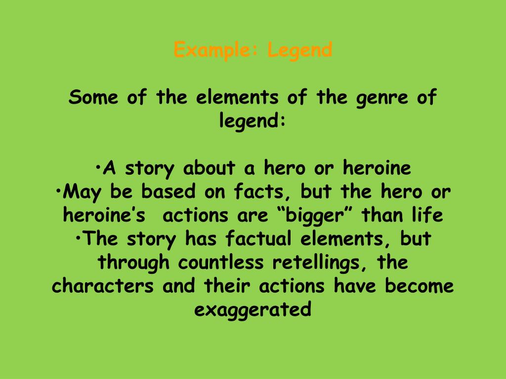 Example: Legend Some of the elements of the genre of legend: A story about a hero or heroine May be based on facts, but the hero or heroine’s actions are “bigger” than life The story has factual elements, but through countless retellings, the characters and their actions have become exaggerated