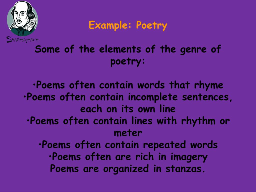 Example: Poetry Some of the elements of the genre of poetry: Poems often contain words that rhyme Poems often contain incomplete sentences, each on its own line Poems often contain lines with rhythm or meter Poems often contain repeated words Poems often are rich in imageryPoems are organized in stanzas.