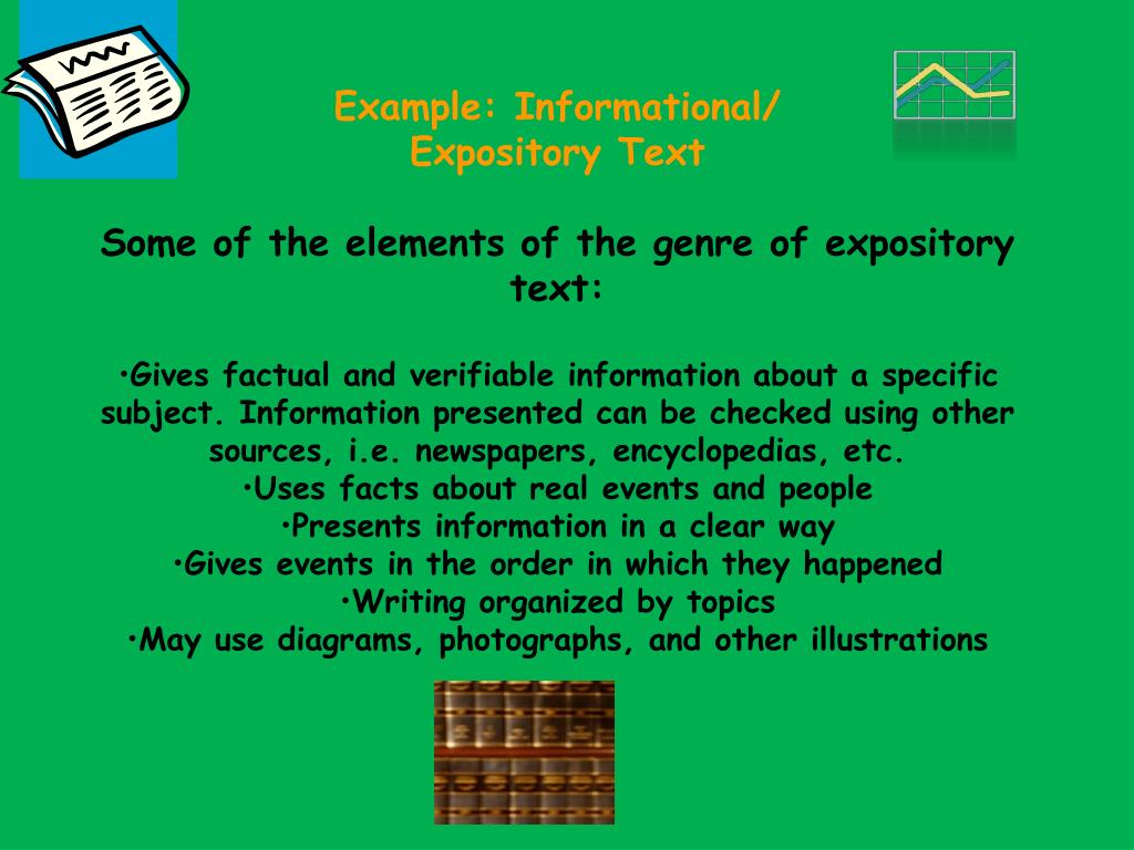 Example: Informational/Expository Text Some of the elements of the genre of expository text: Gives factual and verifiable information about a specific subject. Information presented can be checked using other sources, i.e. newspapers, encyclopedias, etc. Uses facts about real events and people Presents information in a clear way Gives events in the order in which they happened Writing organized by topics May use diagrams, photographs, and other illustrations