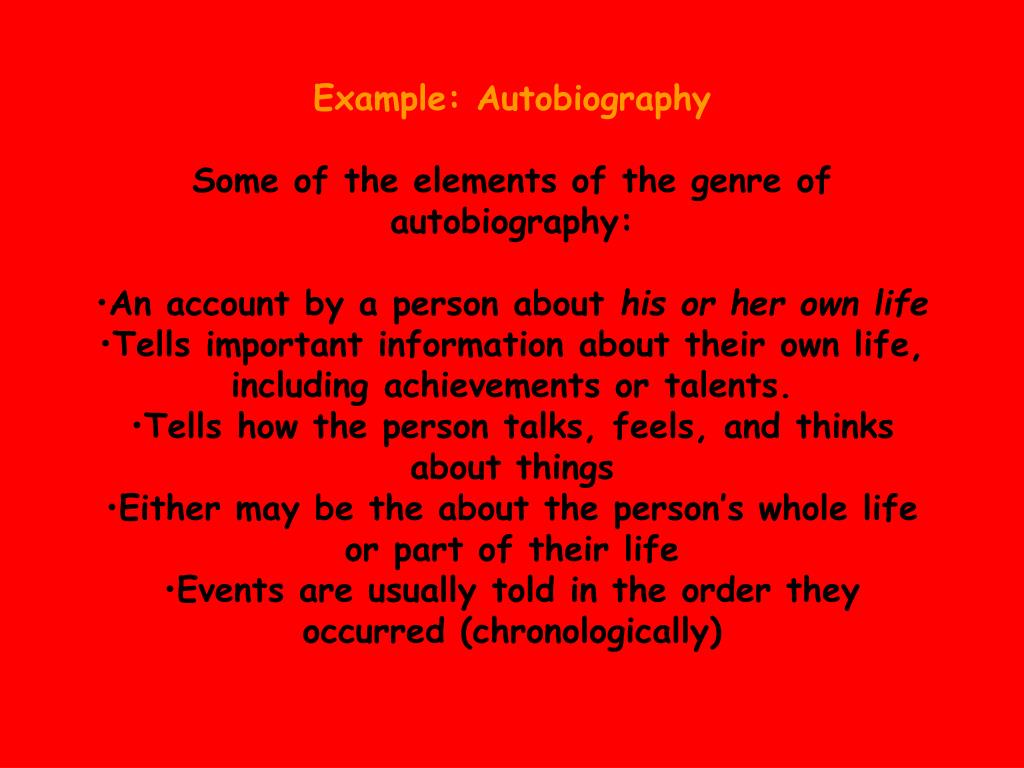 Example: Autobiography Some of the elements of the genre of autobiography: An account by a person about his or her own life Tells important information about their own life, including achievements or talents. Tells how the person talks, feels, and thinks about things Either may be the about the person’s whole life or part of their life Events are usually told in the order they occurred (chronologically)