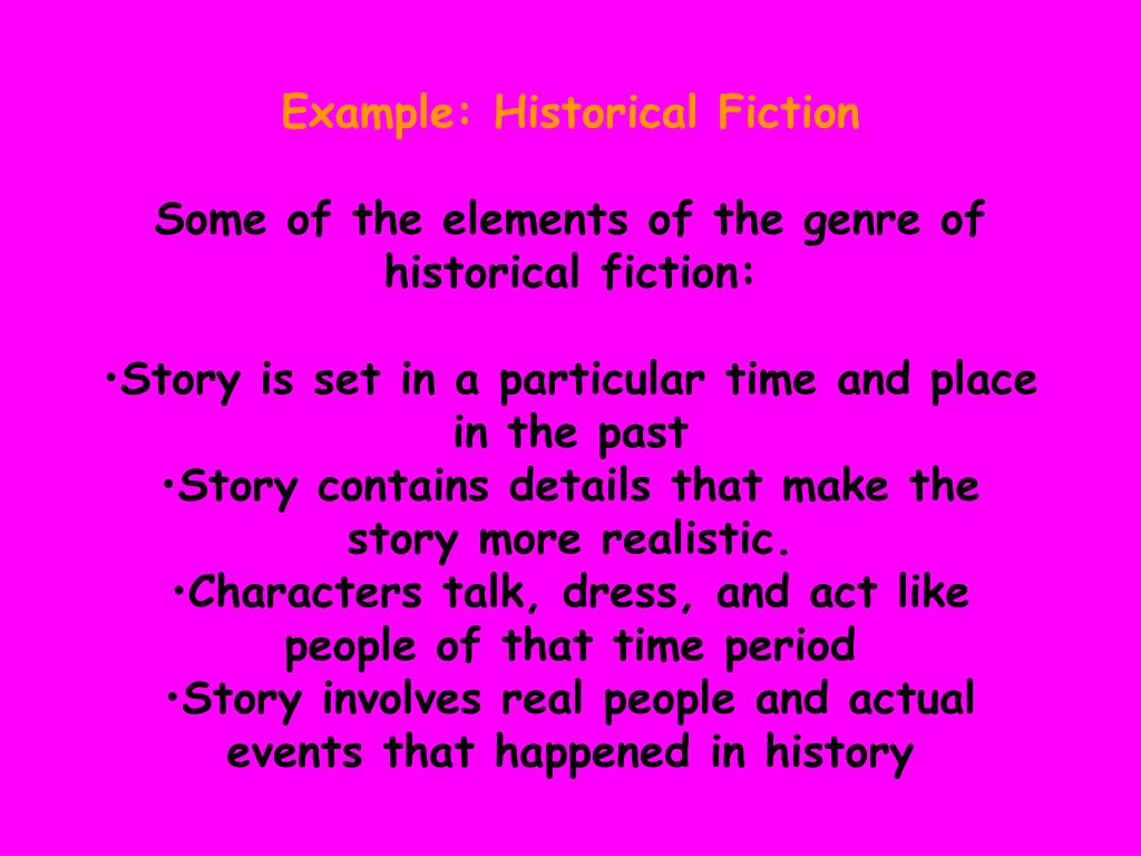 Example: Historical Fiction Some of the elements of the genre of historical fiction: Story is set in a particular time and place in the past Story contains details that make the story more realistic. Characters talk, dress, and act like people of that time period Story involves real people and actual events that happened in history
