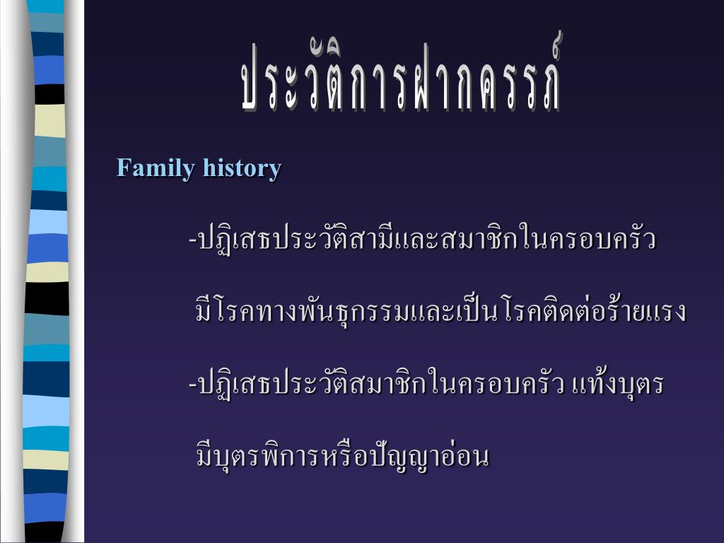 ประวัติการฝากครรภ์ Family history -ปฏิเสธประวัติสามีและสมาชิกในครอบครัว มีโรคทางพันธุกรรมและเป็นโรคติดต่อร้ายแรง -ปฏิเสธประวัติสมาชิกในครอบครัว แท้งบุตร มีบุตรพิการหรือปัญญาอ่อน