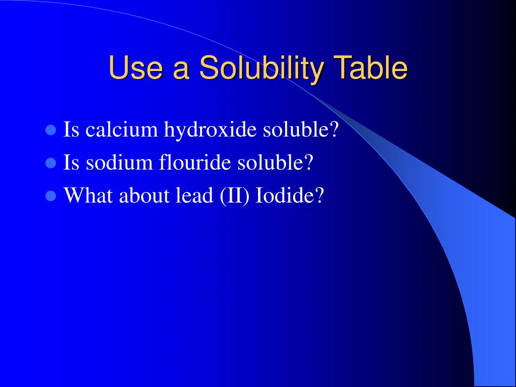 Use a Solubility Table • Is calcium hydroxide soluble? • Is sodium flouride soluble? • What about lead (II) Iodide?