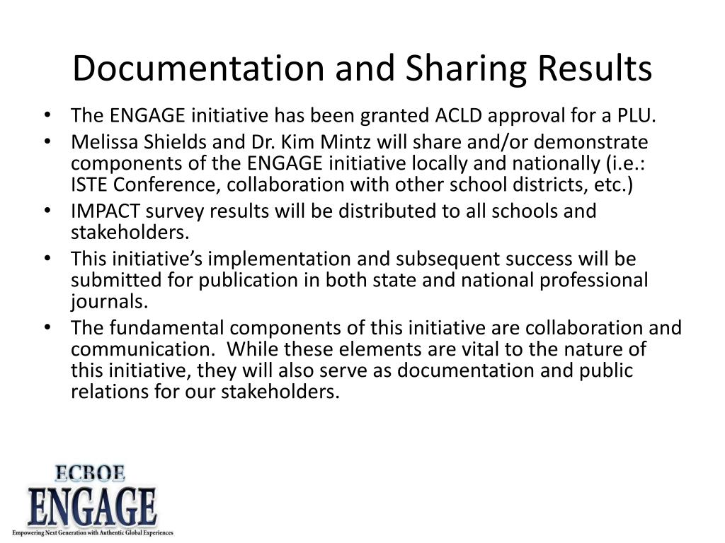 Documentation and Sharing Results • The ENGAGE initiative has been granted ACLD approval for a PLU. • Melissa Shields and Dr. Kim Mintz will share and/or demonstrate components of the ENGAGE initiative locally and nationally (i.e.: ISTE Conference, collaboration with other school districts, etc.) • IMPACT survey results will be distributed to all schools and stakeholders. • This initiative’s implementation and subsequent success will be submitted for publication in both state and national professional journals. • The fundamental components of this initiative are collaboration and communication. While these elements are vital to the nature of this initiative, they will also serve as documentation and public relations for our stakeholders.