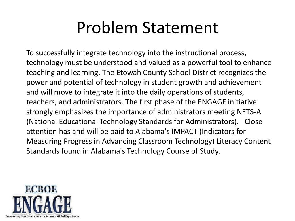 Problem Statement To successfully integrate technology into the instructional process, technology must be understood and valued as a powerful tool to enhance teaching and learning. The Etowah County School District recognizes the power and potential of technology in student growth and achievement and will move to integrate it into the daily operations of students, teachers, and administrators. The first phase of the ENGAGE initiative strongly emphasizes the importance of administrators meeting NETS-A (National Educational Technology Standards for Administrators). Close attention has and will be paid to Alabama's IMPACT (Indicators for Measuring Progress in Advancing Classroom Technology) Literacy Content Standards found in Alabama's Technology Course of Study.
