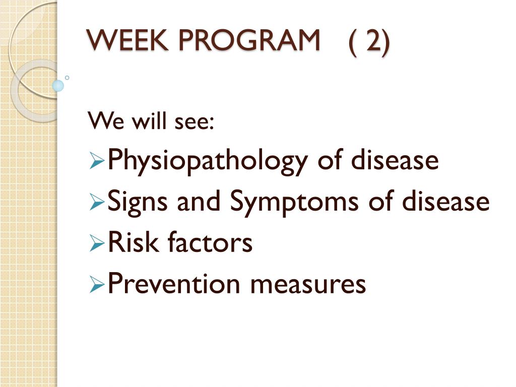 WEEK PROGRAM ( 2) We will see: Physiopathology of disease Signs and Symptoms of disease Risk factors Prevention measures
