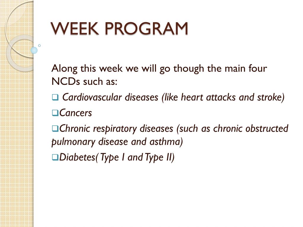 WEEK PROGRAM Along this week we will go though the main four NCDs such as: Cardiovascular diseases (like heart attacks and stroke) Cancers Chronic respiratory diseases (such as chronic obstructed pulmonary disease and asthma) Diabetes( Type I and Type II)