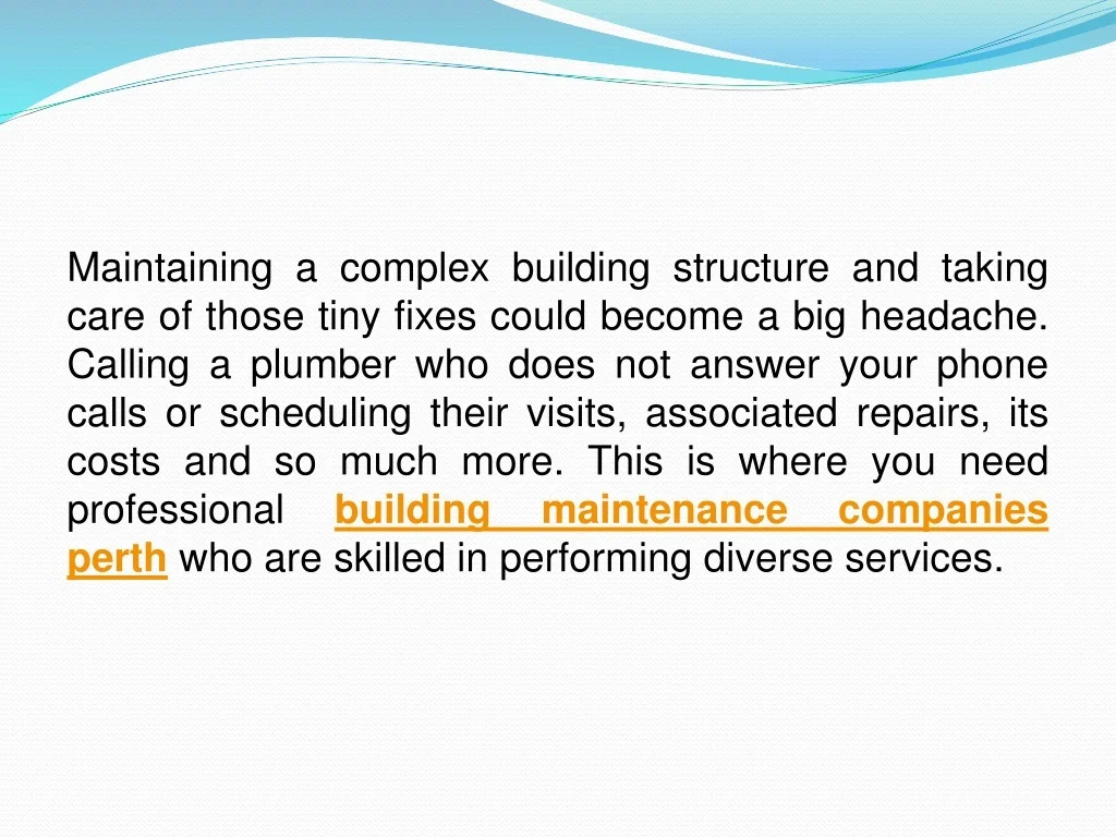 Maintaining a complex building structure and taking care of those tiny fixes could become a big headache. Calling a plumber who does not answer your phone calls or scheduling their visits, associated repairs, its costs and so much more. This is where you need professional building maintenance companies perthwho are skilled in performing diverse services.