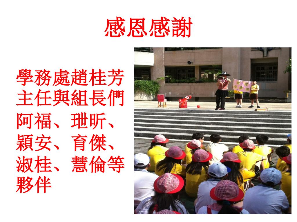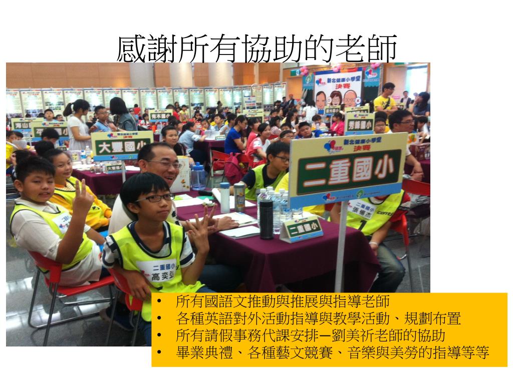 感謝所有協助的老師 • 所有國語文推動與推展與指導老師 • 各種英語對外活動指導與教學活動、規劃布置 • 所有請假事務代課安排—劉美祈老師的協助 • 畢業典禮、各種藝文競賽、音樂與美勞的指導等等