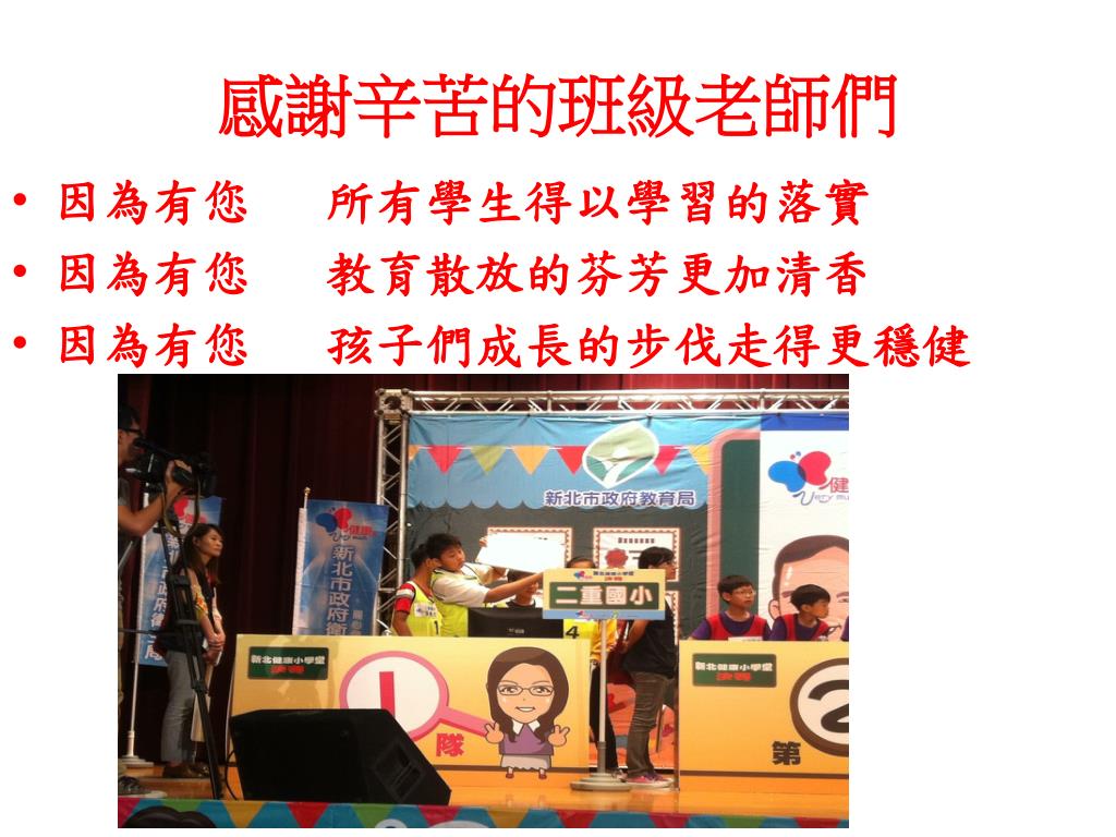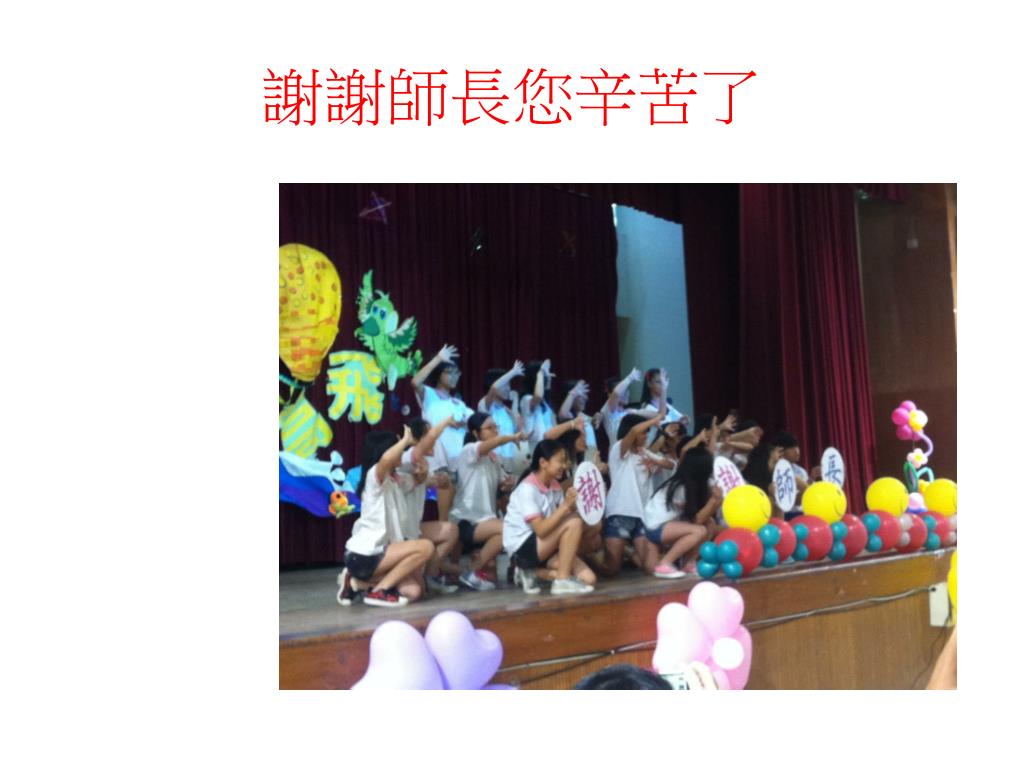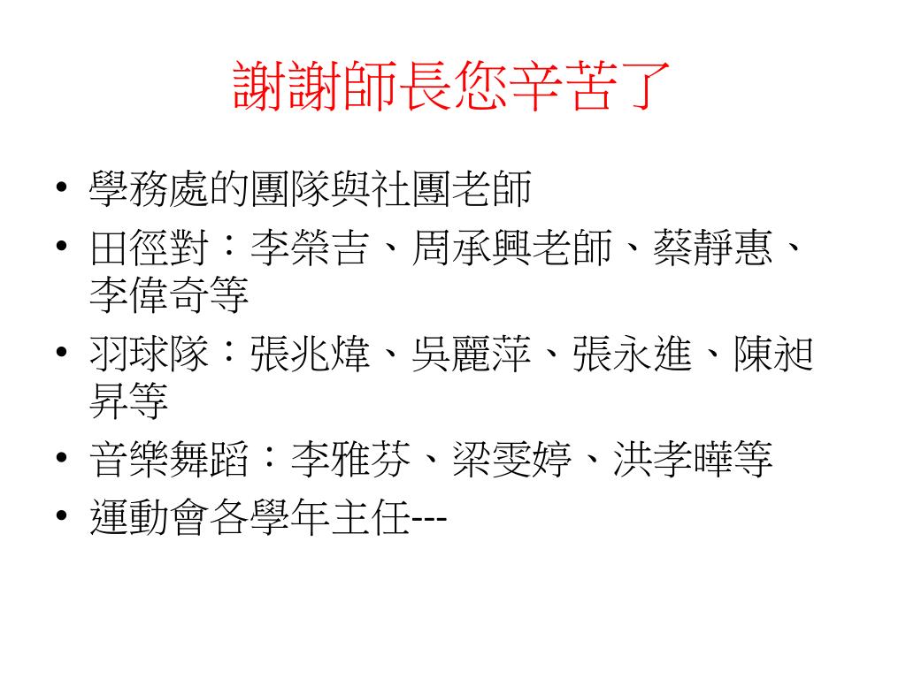 謝謝師長您辛苦了 • 學務處的團隊與社團老師 • 田徑對:李榮吉、周承興老師、蔡靜惠、李偉奇等 • 羽球隊:張兆煒、吳麗萍、張永進、陳昶昇等 • 音樂舞蹈:李雅芬、梁雯婷、洪孝曄等 • 運動會各學年主任---