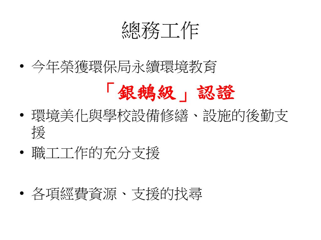 總務工作 • 今年榮獲環保局永續環境教育 「銀鵝級」認證 • 環境美化與學校設備修繕、設施的後勤支援 • 職工工作的充分支援 • 各項經費資源、支援的找尋