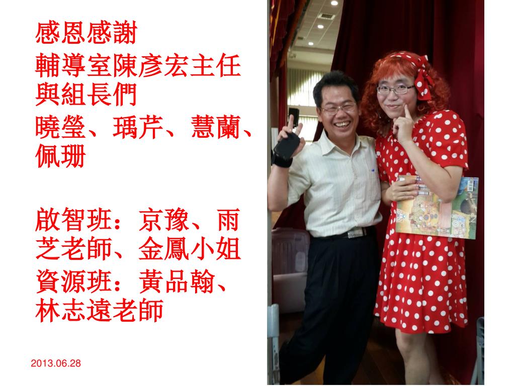 感恩感謝 輔導室陳彥宏主任與組長們 曉瑩、瑀芹、慧蘭、佩珊 啟智班:京豫、雨芝老師、金鳳小姐 資源班:黃品翰、林志遠老師 一