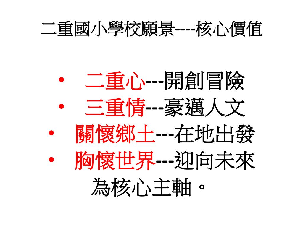 二重國小學校願景----核心價值 • 二重心---開創冒險 • 三重情---豪邁人文 • 關懷鄉土---在地出發 • 胸懷世界---迎向未來 為核心主軸。