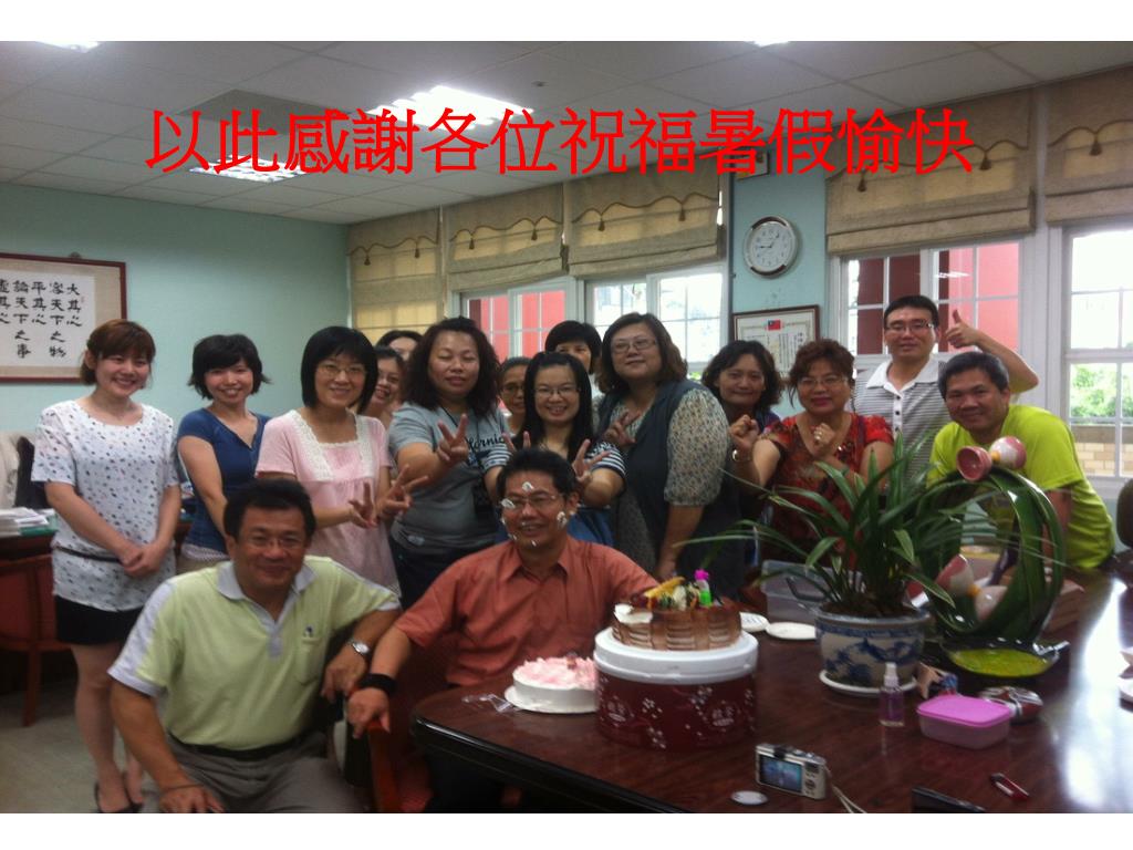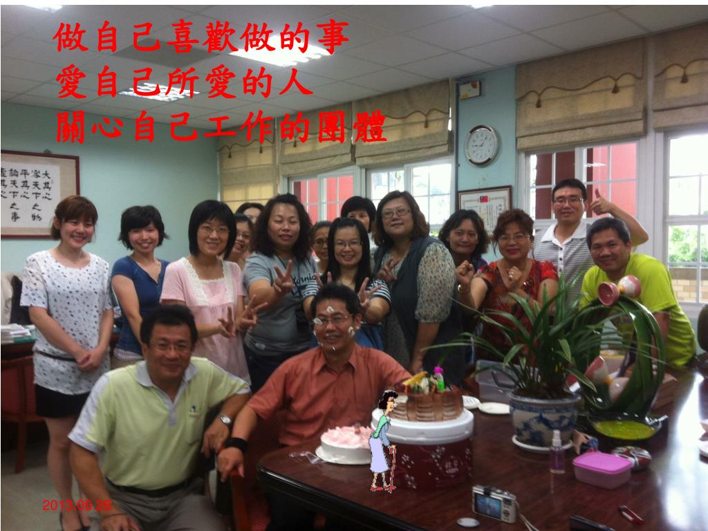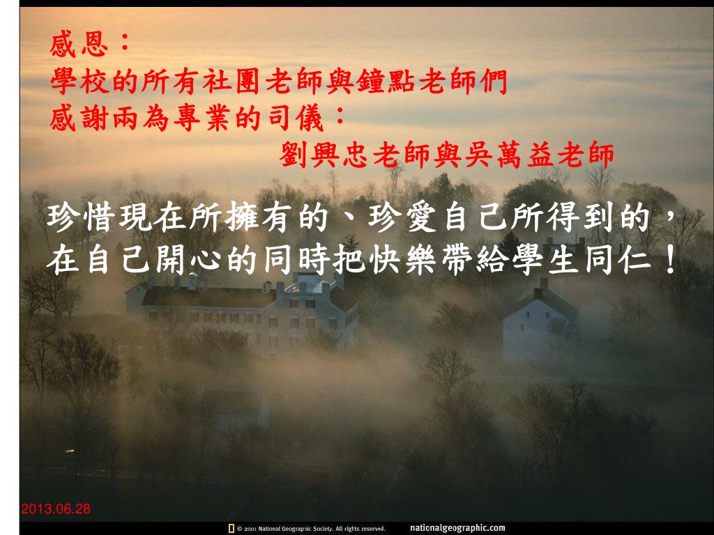 珍惜現在所擁有的、珍愛自己所得到的,在自己開心的同時把快樂帶給學生同仁!珍惜現在所擁有的、珍愛自己所得到的,在自己開心的同時把快樂帶給學生同仁! 感恩: 學校的所有社團老師與鐘點老師們 感謝兩為專業的司儀: 劉興忠老師與吳萬益老師