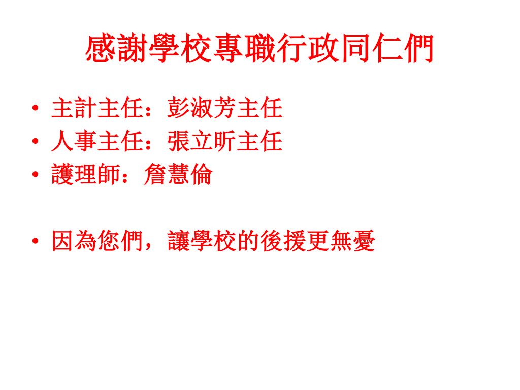 感謝學校專職行政同仁們 • 主計主任:彭淑芳主任 • 人事主任:張立昕主任 • 護理師:詹慧倫 • 因為您們,讓學校的後援更無憂