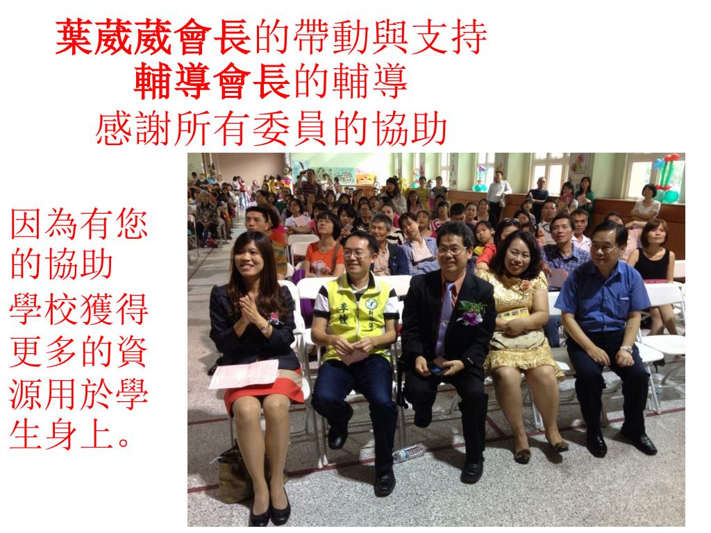 葉葳葳會長的帶動與支持輔導會長的輔導感謝所有委員的協助葉葳葳會長的帶動與支持輔導會長的輔導感謝所有委員的協助 因為有您的協助 學校獲得更多的資源用於學生身上。