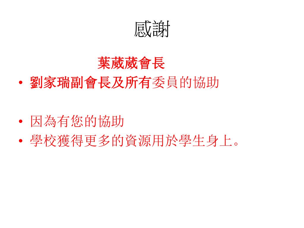感謝 • 謝謝家長會葉葳葳會長的帶動與支持 • 劉家瑞副會長及所有委員的協助 • 因為有您的協助 • 學校獲得更多的資源用於學生身上。