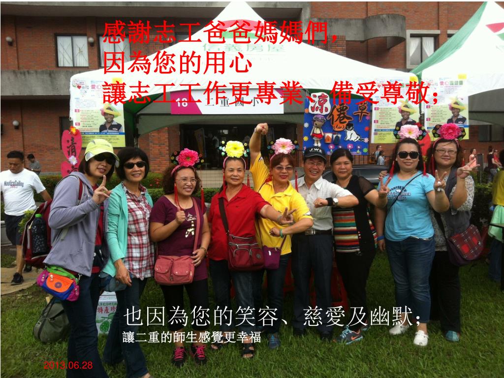 感謝志工爸爸媽媽們, 因為您的用心 讓志工工作更專業、備受尊敬; 也因為您的笑容、慈愛及幽默;讓二重的師生感覺更幸福