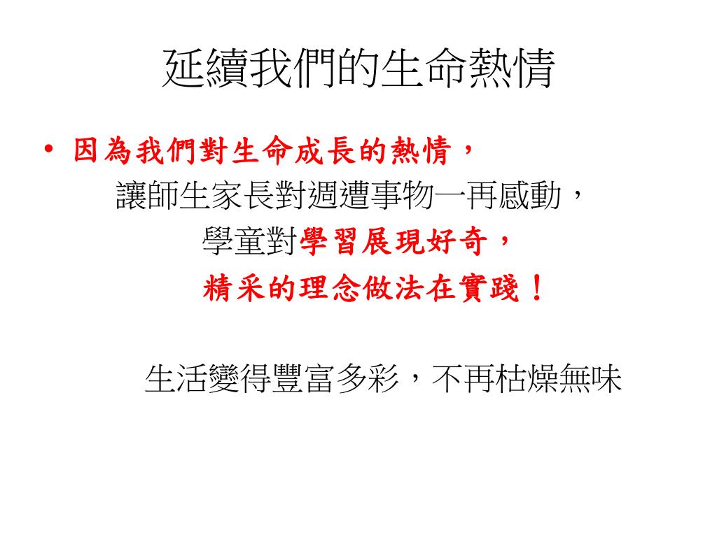 延續我們的生命熱情 • 因為我們對生命成長的熱情, 讓師生家長對週遭事物一再感動, 學童對學習展現好奇, 精采的理念做法在實踐! 生活變得豐富多彩,不再枯燥無味