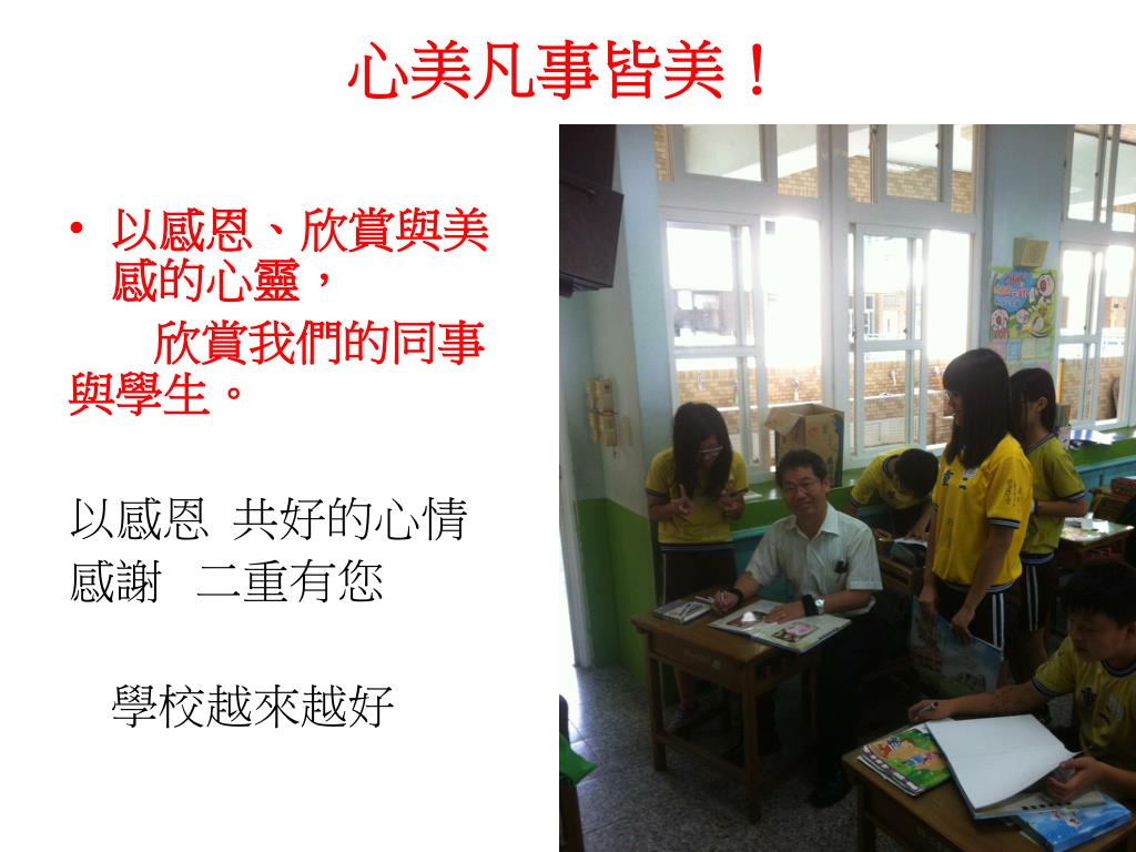 心美凡事皆美! • 以感恩、欣賞與美感的心靈, 欣賞我們的同事與學生。 以感恩 共好的心情 感謝 二重有您 學校越來越好