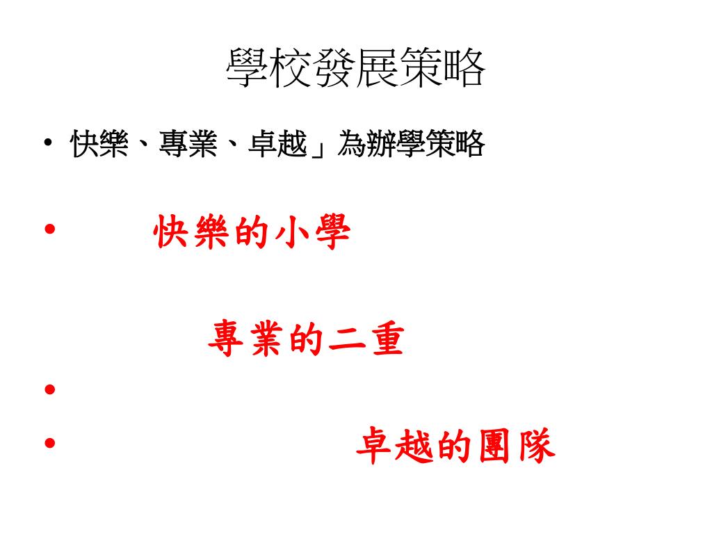 學校發展策略 快樂、專業、卓越」為辦學策略 快樂的小學 專業的二重 卓越的團隊