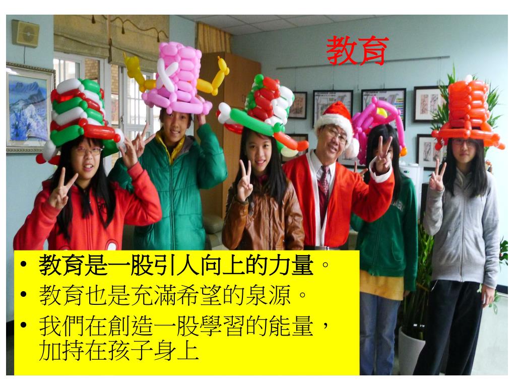 教育 • 教育是一股引人向上的力量。 • 教育也是充滿希望的泉源。 • 我們在創造一股學習的能量,加持在孩子身上
