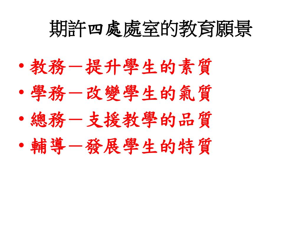 期許四處處室的教育願景 • 教務-提升學生的素質 • 學務-改變學生的氣質 • 總務-支援教學的品質 • 輔導-發展學生的特質