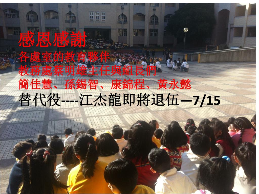 感恩感謝 各處室的教育夥伴 教務處蔡明雄主任與組長們 簡佳慧、孫錫智、康錦程、黃永懿 替代役----江杰龍即將退伍—7/15
