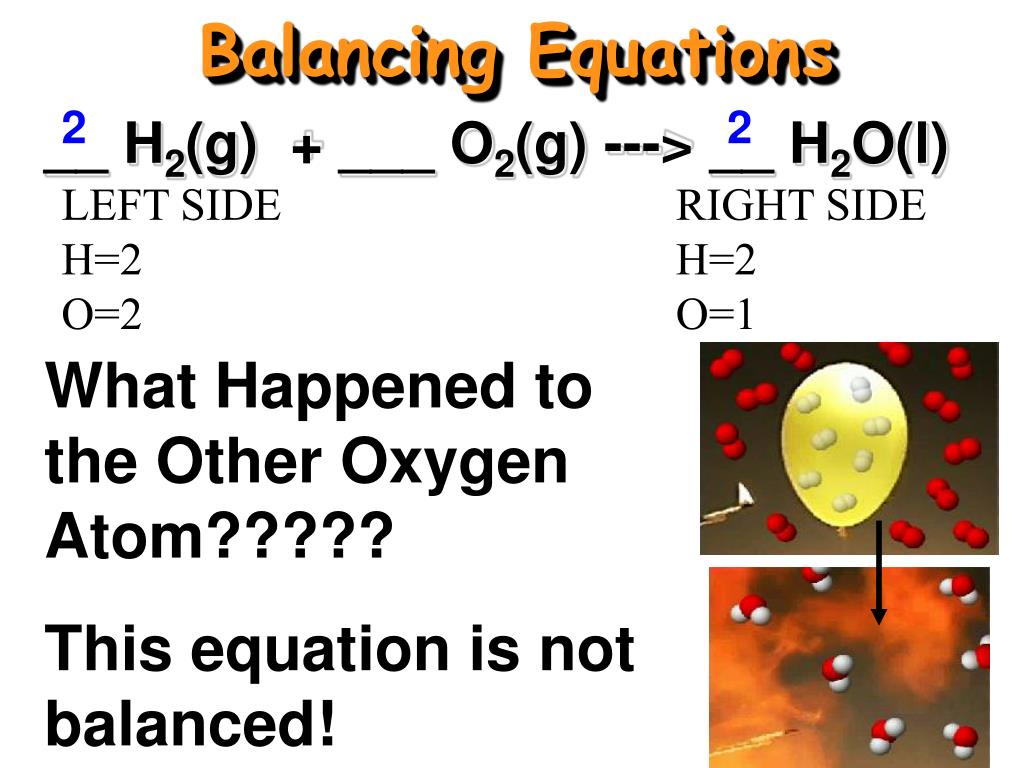 Balancing Equations 2 2 LEFT SIDE RIGHT SIDE H=2 H=2 O=2 O=1 __ H2(g) + ___ O2(g) ---> __ H2O(l) What Happened to the Other Oxygen Atom????? This equation is not balanced!