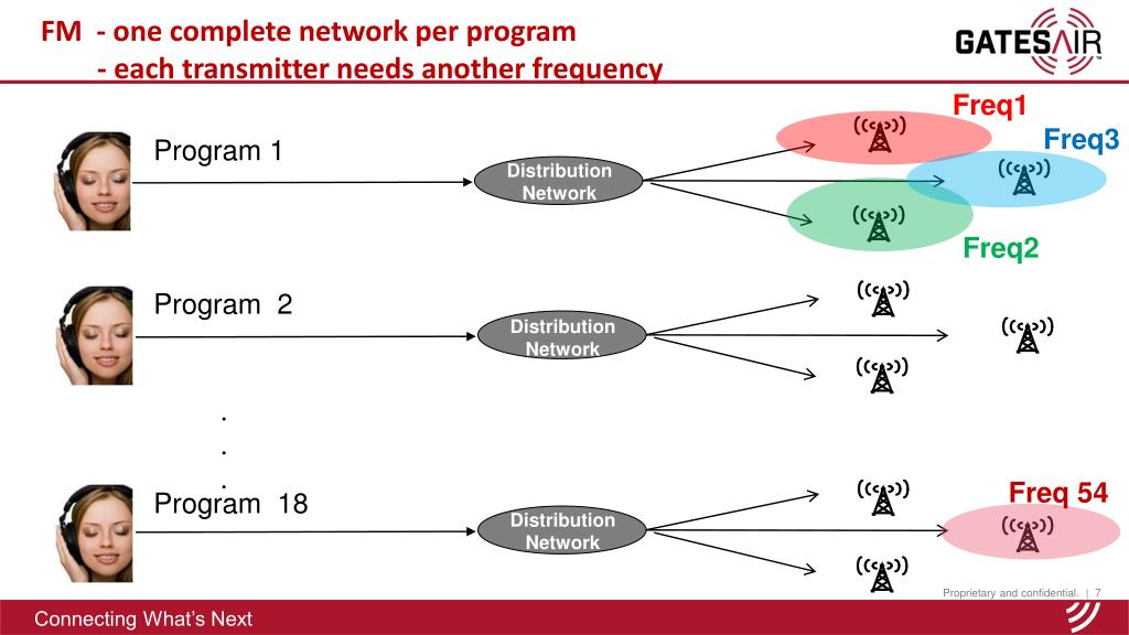 FM - one complete network per program - each transmitter needs another frequency Freq1 Freq3 Program 1 Distribution Network Freq2 Program 2 Distribution Network . . . Freq 54 Program 18 Distribution Network