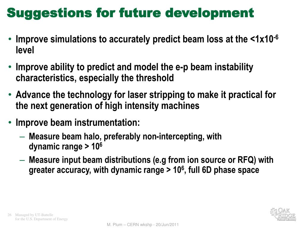 Suggestions for future development • Improve simulations to accurately predict beam loss at the <1x10-6 level • Improve ability to predict and model the e-p beam instability characteristics, especially the threshold • Advance the technology for laser stripping to make it practical for the next generation of high intensity machines • Improve beam instrumentation: • Measure beam halo, preferably non-intercepting, with dynamic range > 106 • Measure input beam distributions (e.g from ion source or RFQ) with greater accuracy, with dynamic range > 106, full 6D phase space