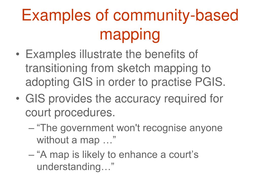 Examples of community-based mapping Examples illustrate the benefits of transitioning from sketch mapping to adopting GIS in order to practise PGIS. GIS provides the accuracy required for court procedures. “The government won't recognise anyone without a map …” “A map is likely to enhance a court’s understanding…”
