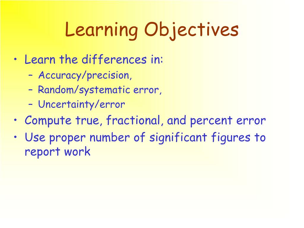 Significant Figures. Learning Objectives. Learn the differences in: Accuracy/precision, Random/systematic error, Uncertainty/error Compute true, fractional, and percent error Use proper number of significant figures to report work. Integer and Real Values.