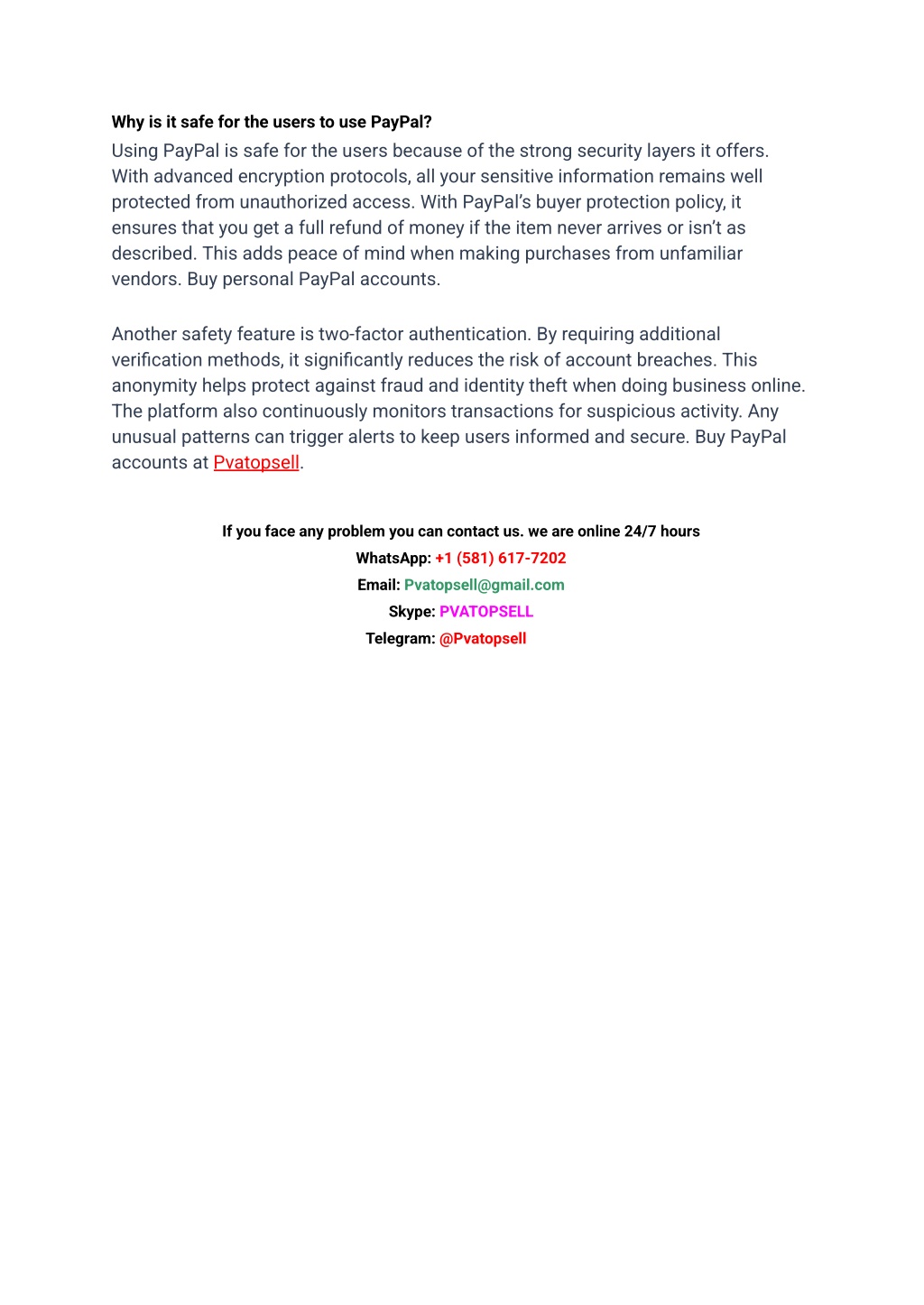 Why is it safe for the users to use PayPal? Using PayPal is safe for the users because of the strong security layers it offers. With advanced encryption protocols, all your sensitive information remains well protected from unauthorized access. With PayPal’s buyer protection policy, it ensures that you get a full refund of money if the item never arrives or isn’t as described. This adds peace of mind when making purchases from unfamiliar vendors. Buy personal PayPal accounts. Another safety feature is two-factor authentication. By requiring additional verification methods, it significantly reduces the risk of account breaches. This anonymity helps protect against fraud and identity theft when doing business online. The platform also continuously monitors transactions for suspicious activity. Any unusual patterns can trigger alerts to keep users informed and secure. Buy PayPal accounts at Pvatopsell. If you face any problem you can contact us. we are online 24/7 hours WhatsApp: +1 (581) 617-7202 Email: Pvatopsell@gmail.com Skype: PVATOPSELL Telegram: @Pvatopsell