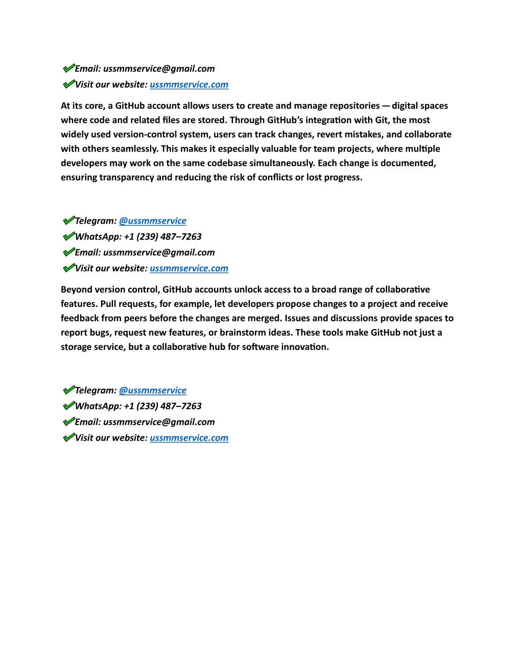 Security is another important aspect of GitHub accounts. Features like two-factor authentjcatjon, SSH keys, and secret scanning help protect users’ code and data. GitHub also ofgers private repositories, which allow individuals or teams to work on confjdentjal projects without exposing sensitjve informatjon. For organizatjons, GitHub provides advanced permission controls and enterprise-level security optjons. Finally, GitHub accounts ofger access to a vibrant global community. Millions of developers contribute to open-source projects, share knowledge, and collaborate on sofuware that powers modern technology. Whether contributjng to a well-known project or startjng a new one, GitHub users become part of a dynamic ecosystem that encourages learning and innovatjon. Telegram: @ussmmservice WhatsApp: +1 (239) 487–7263 Email: ussmmservice@gmail.com Visit our website: ussmmservice.com In summary, a GitHub account is more than just a login — it is a powerful gateway to coding, collaboratjon, and career growth in the digital age. Telegram: @ussmmservice WhatsApp: +1 (239) 487–7263 Email: ussmmservice@gmail.com Visit our website: ussmmservice.com