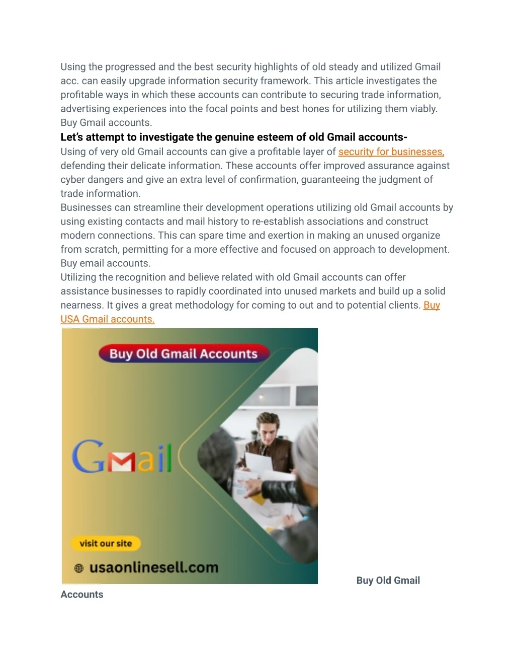 Please contact us for better communication. USA best Gmail Accounts Visit now: https://usaonlinesell.com/product/buy-old-gmail-accounts/ WhatsApp: +1 (561)480-9250 Email: usaonlinesell@gmail.com Skype: USAONLINESELL Telegram: @usaonlinesell During a security review, it is critical to survey and upgrade security settings, counting watchword quality and two-factor verification. Also, businesses ought to survey and overhaul recuperation conventions, such as account recuperation choices and reinforcement strategies. This can guarantee the security breach and genuine information misfortunes, the required steps may be taken to secure trade profile data. Buy Gmail accounts. Why businesses select to buy aged Gmail accounts? Buy aged Gmail accounts. Having an aged e-mail account, shows the commerce has been around want for help. This can offer assistance construct believe with clients who may be reluctant to work with a modern or obscure commerce. An aged Gmail account can too offer assistance to confirm the authenticity of a trade, as it appears that the commerce has been utilizing the same e-mail address for an amplified period of time. Buy aged Gmail accounts at the best supplier Usaonlinesell.com Older Gmail accounts are less powerless to mechanized assaults, such as phishing tricks and spam emails. This is since Gmail accounts that have been dynamic for a longer period of time have built up notoriety with mail suppliers. This notoriety is based on the account’s history of sending and getting emails. This can offer assistance secure a business’s touchy information and guarantee that vital emails are conveyed to clients without being sifted out as spam. How can old Gmail accounts ensure client data and delicate data? Old Gmail accounts can offer assistance ensure commerce information by giving a secure stage for communication and archive capacity. Through progressed security highlights and long-standing notoriety, these accounts offer an included layer of assurance for delicate trade information. Using of old Gmail accounts, businesses can defend their information from potential breaches and unauthorized get to, in this way guaranteeing the keenness and secrecy of their important data. In today’s e-commerce scene, defending trade data is has importance.