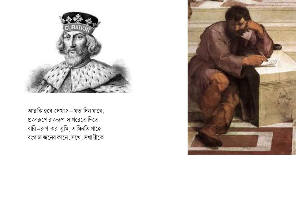 আরকিহবেদেখা ? – যতদিনযাবে, প্রজারূপেরাজরূপসাগরেতেদিতে বারি –রূপকরতুমি ; এ মিনতিগাহে বংগ জ জনেরকানে , সখে , সখারীতে