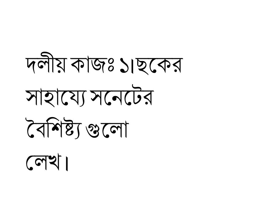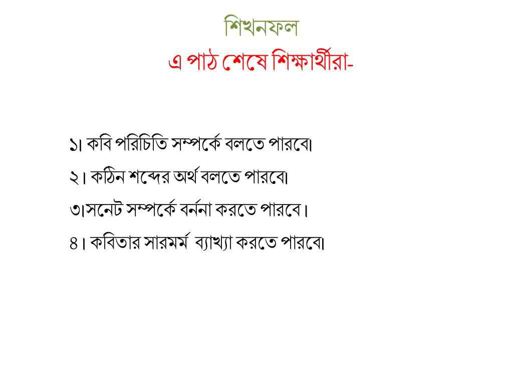 শিখনফলএ পাঠশেষেশিক্ষার্থীরা- ১। কবিপরিচিতিসম্পর্কেবলতেপারবে। ২ । কঠিনশব্দেরঅর্থবলতেপারবে। ৩।সনেট সম্পর্কেবর্ননাকরতেপারবে । ৪ । কবিতারসারমর্মব্যাখ্যাকরতেপারবে।