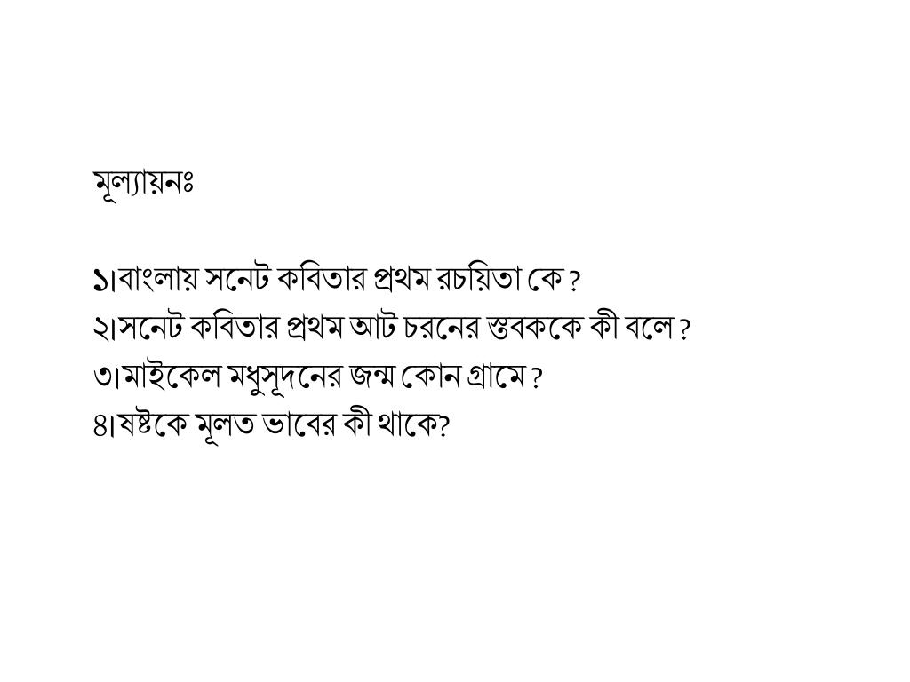 মূল্যায়নঃ ১।বাংলায় সনেটকবিতারপ্রথমরচয়িতাকে? ২।সনেট কবিতারপ্রথমআটচরনেরস্তবককেকীবলে ? ৩।মাইকেল মধুসূদনেরজন্মকোনগ্রামে ? ৪।ষষ্টকে মূলতভাবেরকীথাকে?