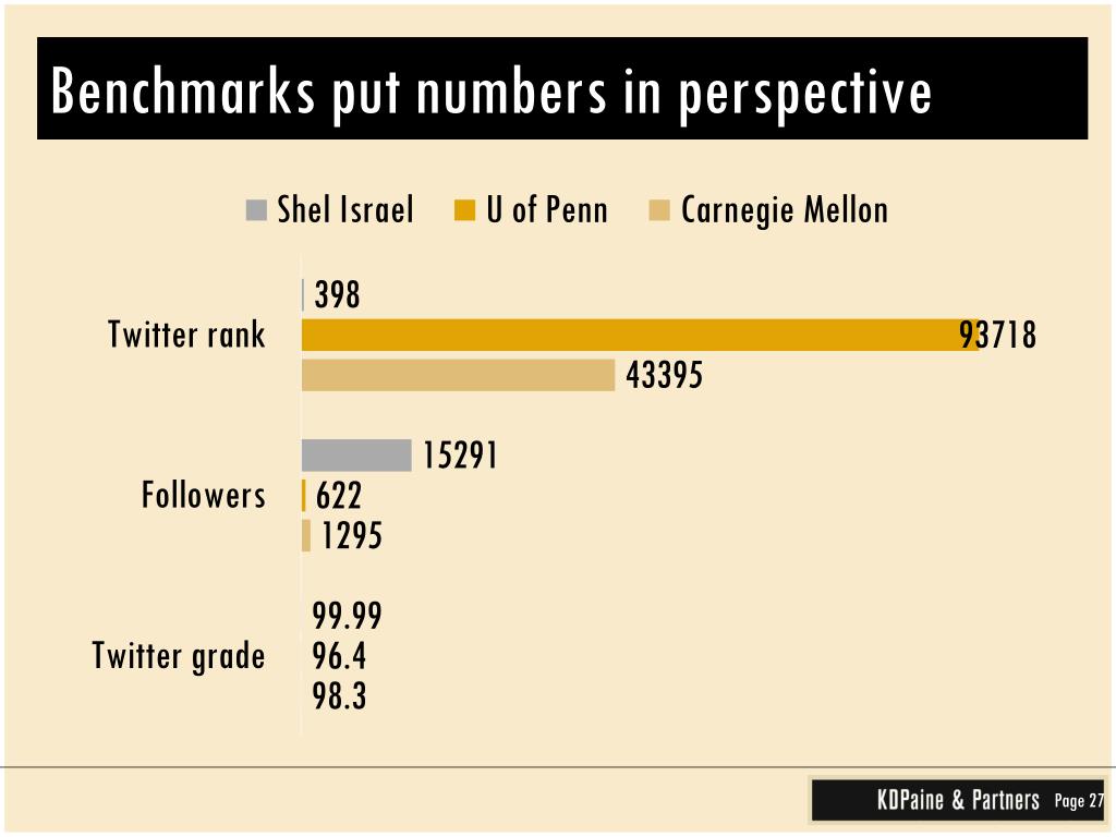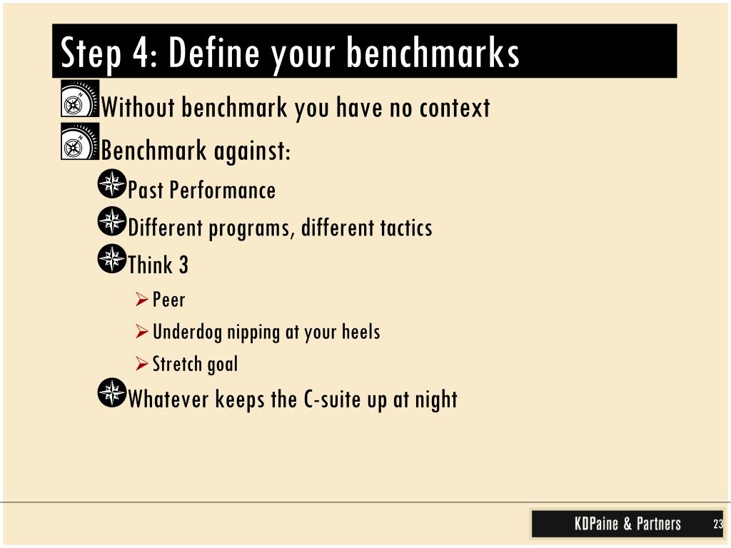 Without benchmark you have no context Benchmark against: Past Performance Different programs, different tactics Think 3 Peer Underdog nipping at your heels Stretch goal Whatever keeps the C-suite up at night Step 4: Define your benchmarks