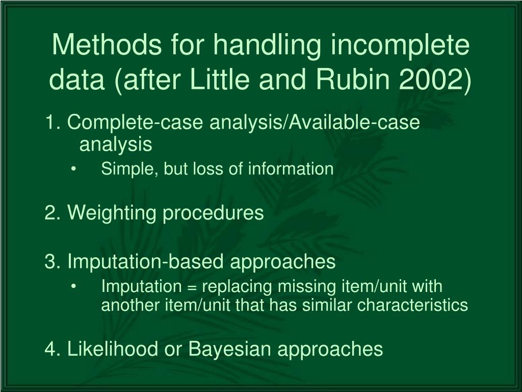Methods for handling incomplete data (after Little and Rubin 2002) 1. Complete-case analysis/Available-case analysis • Simple, but loss of information 2. Weighting procedures 3. Imputation-based approaches • Imputation = replacing missing item/unit with another item/unit that has similar characteristics 4. Likelihood or Bayesian approaches