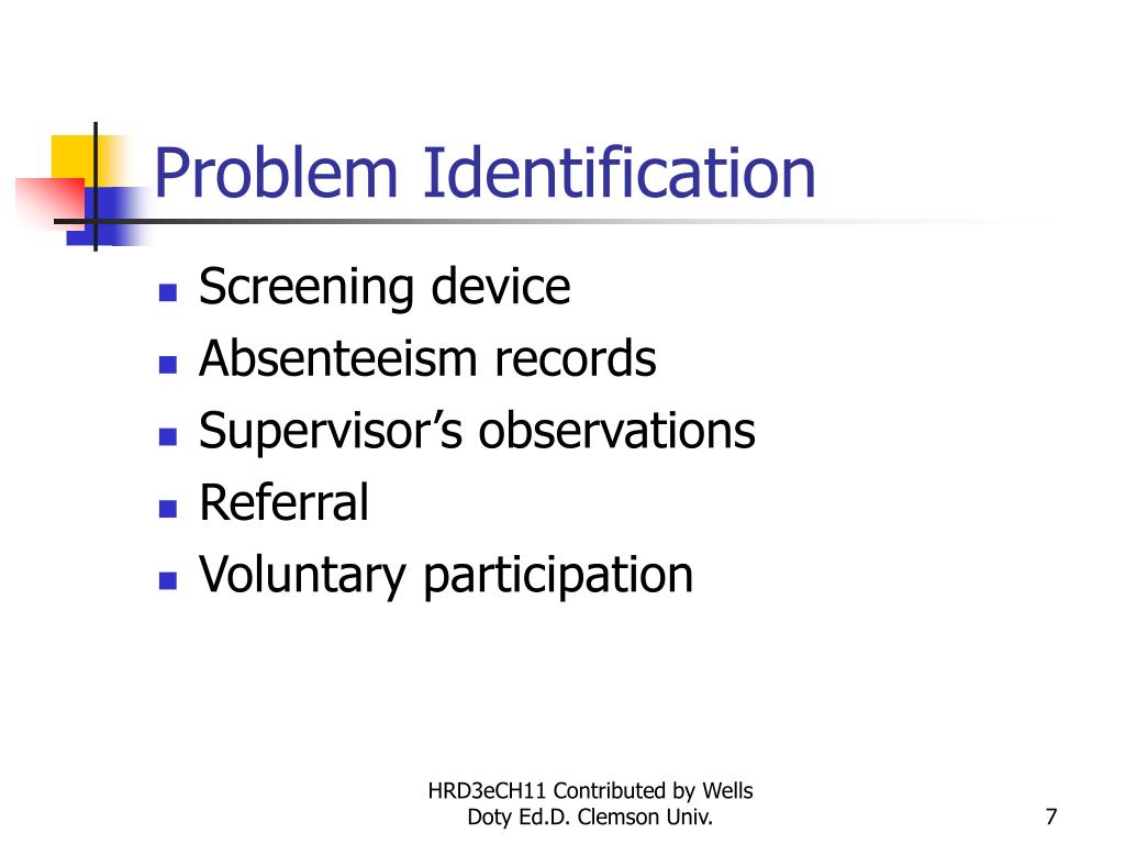 Problem Identification • Screening device • Absenteeism records • Supervisor’s observations • Referral • Voluntary participation HRD3eCH11 Contributed by Wells Doty Ed.D. Clemson Univ.