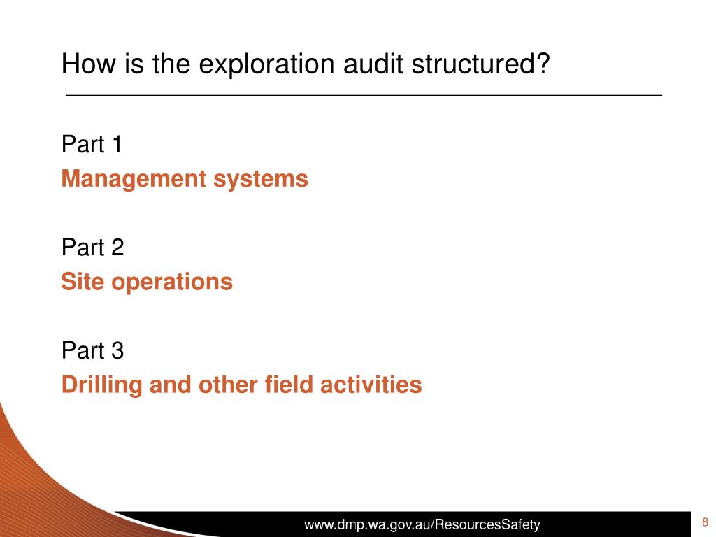 How is the exploration audit structured? Part 1 Management systems Part 2 Site operations Part 3 Drilling and other field activities