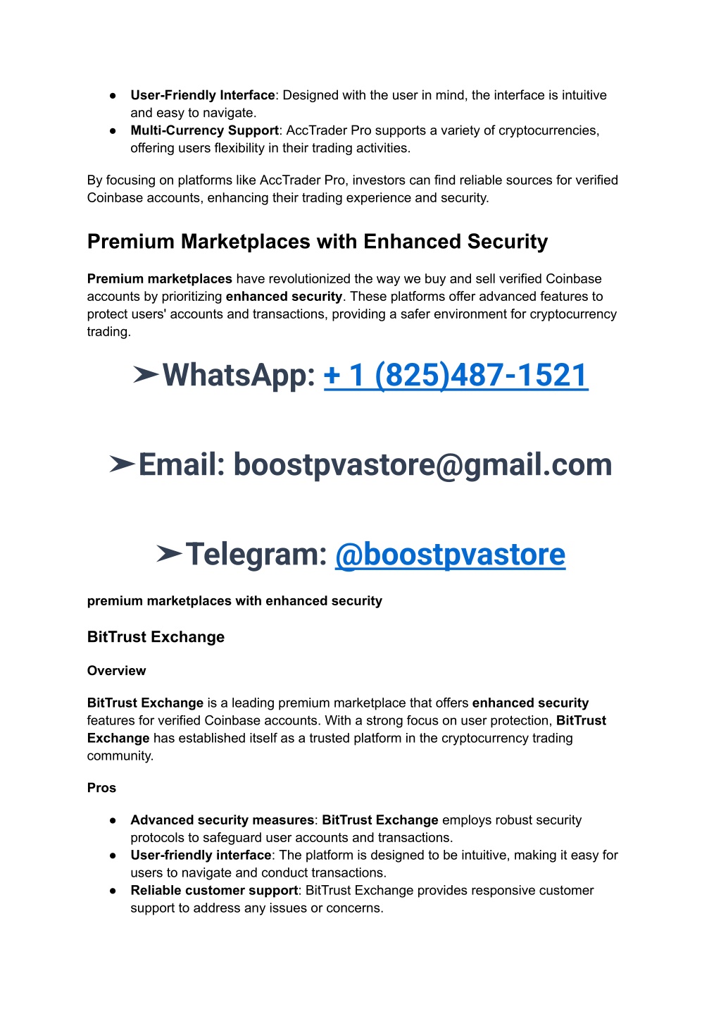 5. ● User-Friendly Interface: Designed with the user in mind, the interface is intuitive and easy to navigate. ● Multi-Currency Support: AccTrader Pro supports a variety of cryptocurrencies, offering users flexibility in their trading activities. By focusing on platforms like AccTrader Pro, investors can find reliable sources for verified Coinbase accounts, enhancing their trading experience and security. Premium Marketplaces with Enhanced Security Premium marketplaces have revolutionized the way we buy and sell verified Coinbase accounts by prioritizing enhanced security. These platforms offer advanced features to protect users' accounts and transactions, providing a safer environment for cryptocurrency trading. ➤WhatsApp: + 1 (825)487-1521 ➤Email: boostpvastore@gmail.com ➤Telegram: @boostpvastore premium marketplaces with enhanced security BitTrust Exchange Overview BitTrust Exchange is a leading premium marketplace that offers enhanced security features for verified Coinbase accounts. With a strong focus on user protection, BitTrust Exchange has established itself as a trusted platform in the cryptocurrency trading community. Pros ● Advanced security measures: BitTrust Exchange employs robust security protocols to safeguard user accounts and transactions. ● User-friendly interface: The platform is designed to be intuitive, making it easy for users to navigate and conduct transactions. ● Reliable customer support: BitTrust Exchange provides responsive customer support to address any issues or concerns.