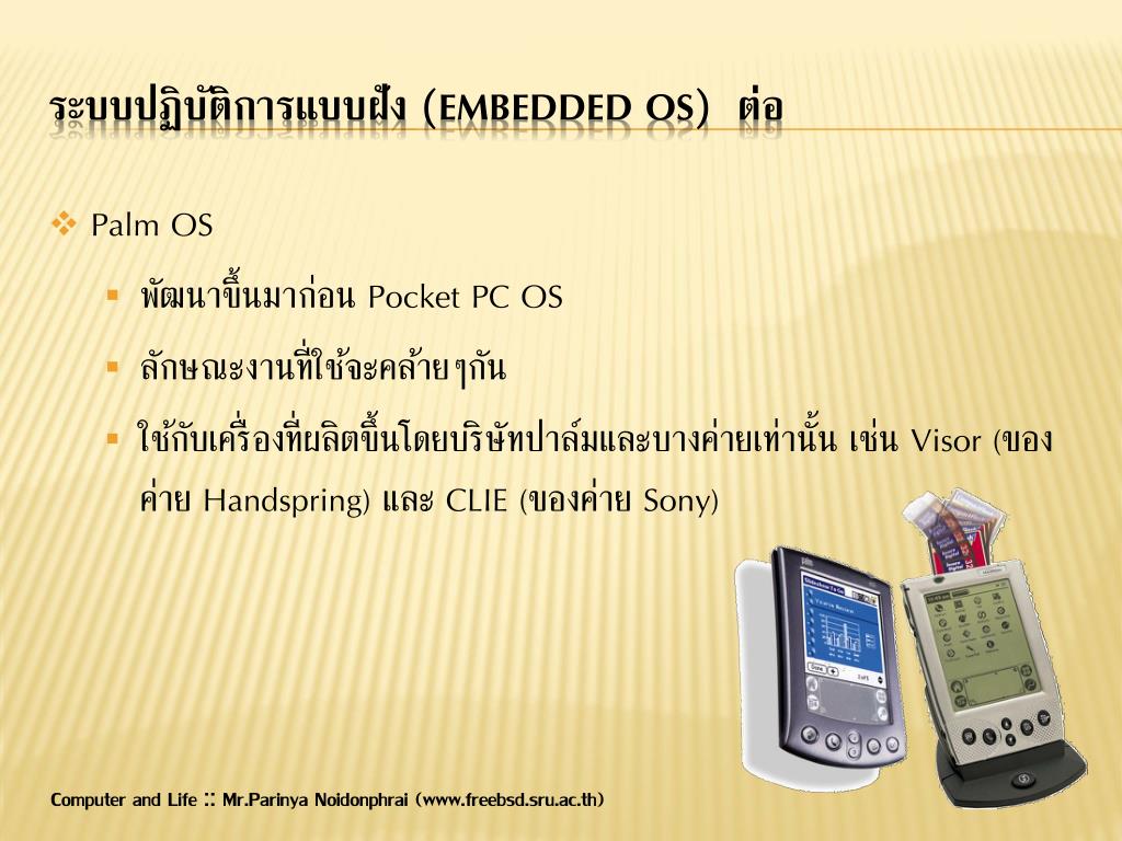 Palm OS • พัฒนาขึ้นมาก่อน Pocket PC OS • ลักษณะงานที่ใช้จะคล้ายๆกัน • ใช้กับเครื่องที่ผลิตขึ้นโดยบริษัทปาล์มและบางค่ายเท่านั้น เช่น Visor (ของค่าย Handspring) และ CLIE (ของค่าย Sony) ระบบปฏิบัติการแบบฝัง (embedded OS) ต่อ