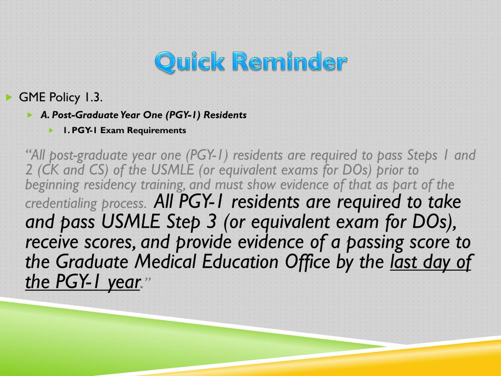 GME Policy 1.3. A. Post-Graduate Year One (PGY-1) Residents 1. PGY-1 Exam Requirements Quick Reminder “All post-graduate year one (PGY-1) residents are required to pass Steps 1 and 2 (CK and CS) of the USMLE (or equivalent exams for DOs) prior to beginning residency training, and must show evidence of that as part of the credentialing process. All PGY-1 residents are required to take and pass USMLE Step 3 (or equivalent exam for DOs), receive scores, and provide evidence of a passing score to the Graduate Medical Education Office by the last day of the PGY-1 year.”