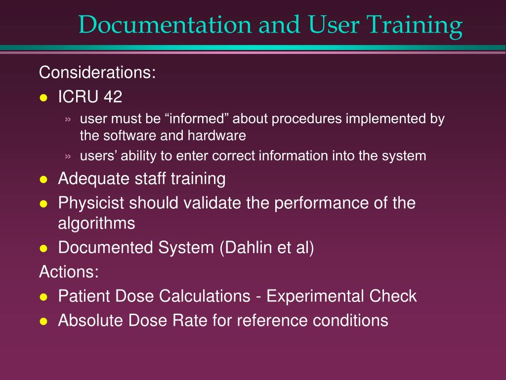 Documentation and User Training Considerations: • ICRU 42 • user must be “informed” about procedures implemented by the software and hardware • users’ ability to enter correct information into the system • Adequate staff training • Physicist should validate the performance of the algorithms • Documented System (Dahlin et al) Actions: • Patient Dose Calculations - Experimental Check • Absolute Dose Rate for reference conditions