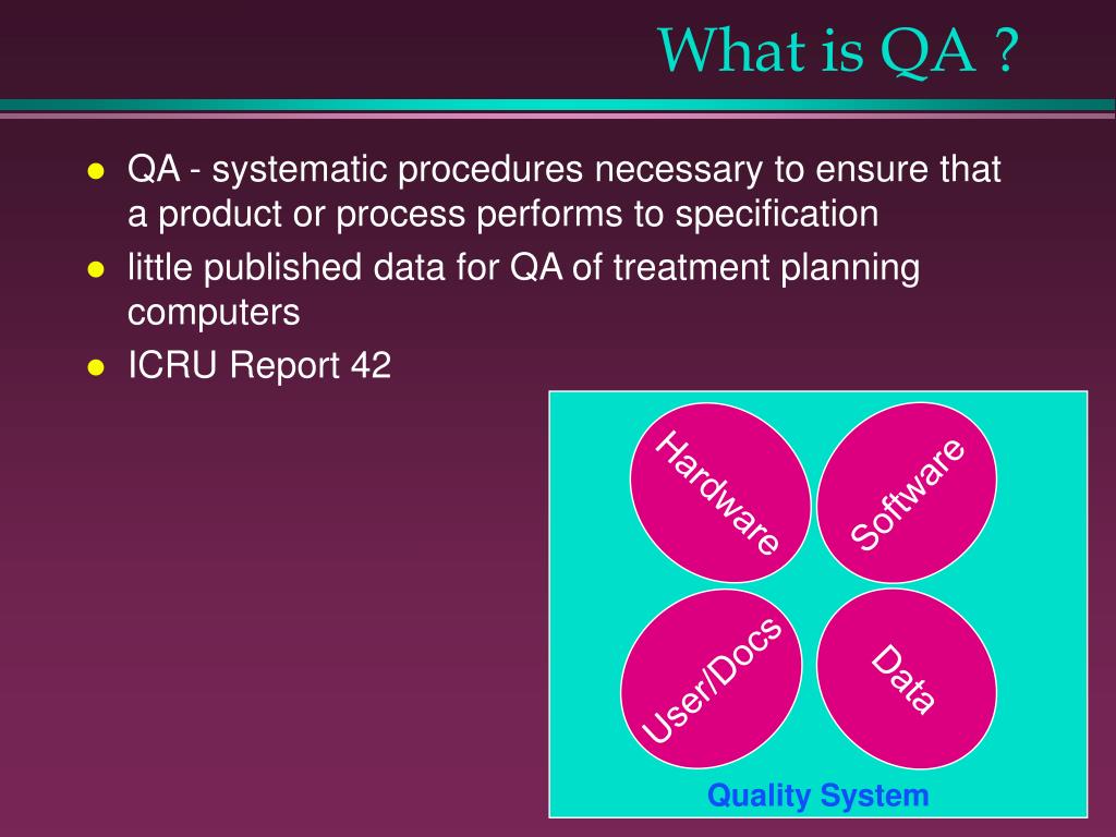 Hardware Software User/Docs Data What is QA ? • QA - systematic procedures necessary to ensure that a product or process performs to specification • little published data for QA of treatment planning computers • ICRU Report 42 Quality System
