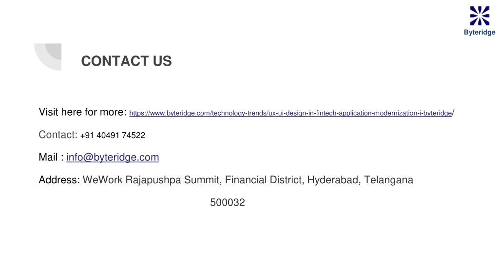 Byteridge CONTACT US Visit here for more: https://www.byteridge.com/technology-trends/ux-ui-design-in-fintech-application-modernization-i-byteridge/ Contact:+91 40491 74522 Mail : info@byteridge.com Address: WeWork Rajapushpa Summit, Financial District, Hyderabad, Telangana 500032