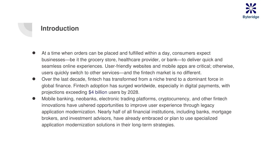 Byteridge Introduction • At a time when orders can be placed and fulfilled within a day, consumers expect businesses—be it the grocery store, healthcare provider, or bank—to deliver quick and seamless online experiences. User-friendly websites and mobile apps are critical; otherwise, users quickly switch to other services—and the fintech market is no different. • Over the last decade, fintech has transformed from a niche trend to a dominant force in global finance. Fintech adoption has surged worldwide, especially in digital payments, with projections exceeding $4 billion users by 2028. • Mobile banking, neobanks, electronic trading platforms, cryptocurrency, and other fintech innovations have ushered opportunities to improve user experience through legacy application modernization. Nearly half of all financial institutions, including banks, mortgage brokers, and investment advisors, have already embraced or plan to use specialized application modernization solutions in their long-term strategies.